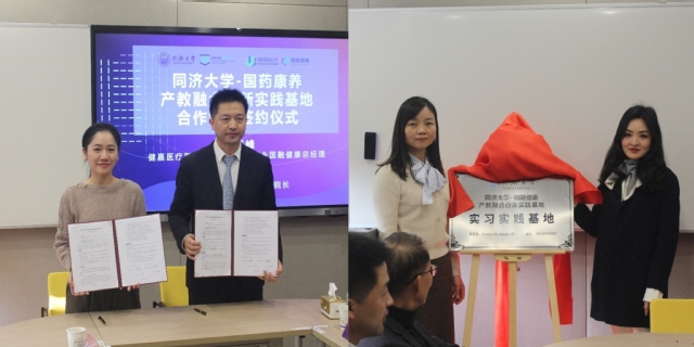 国药康养总经理徐亚峰与学院副院长胡琪代表双方签署基地协议并介绍合作内容,国药康养副总经理柳晓红与学院副书记李疏贝为基地揭牌。