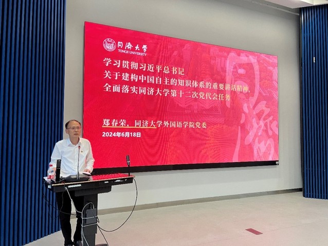在报告中,郑春荣首先带领大家重温了习近平总书记关于建构中国自主的知识体系的重要论断。其后,郑春荣谈了以“数智化、绿色化、融合化”为路径,深入贯彻学校第十二次党代会决策部署的体会。最后,郑春荣结合外语学科在新阶段的高质量发展,提出同济外语人在建构中国自主的知识体系上所应做出的努力。