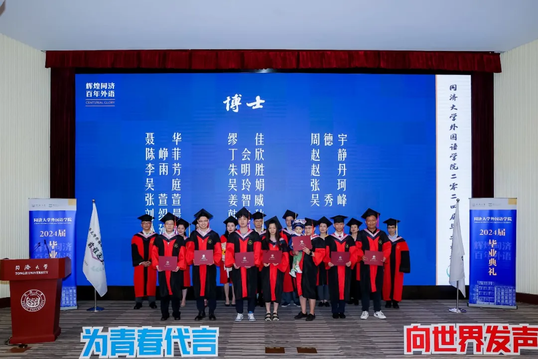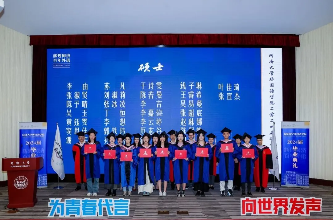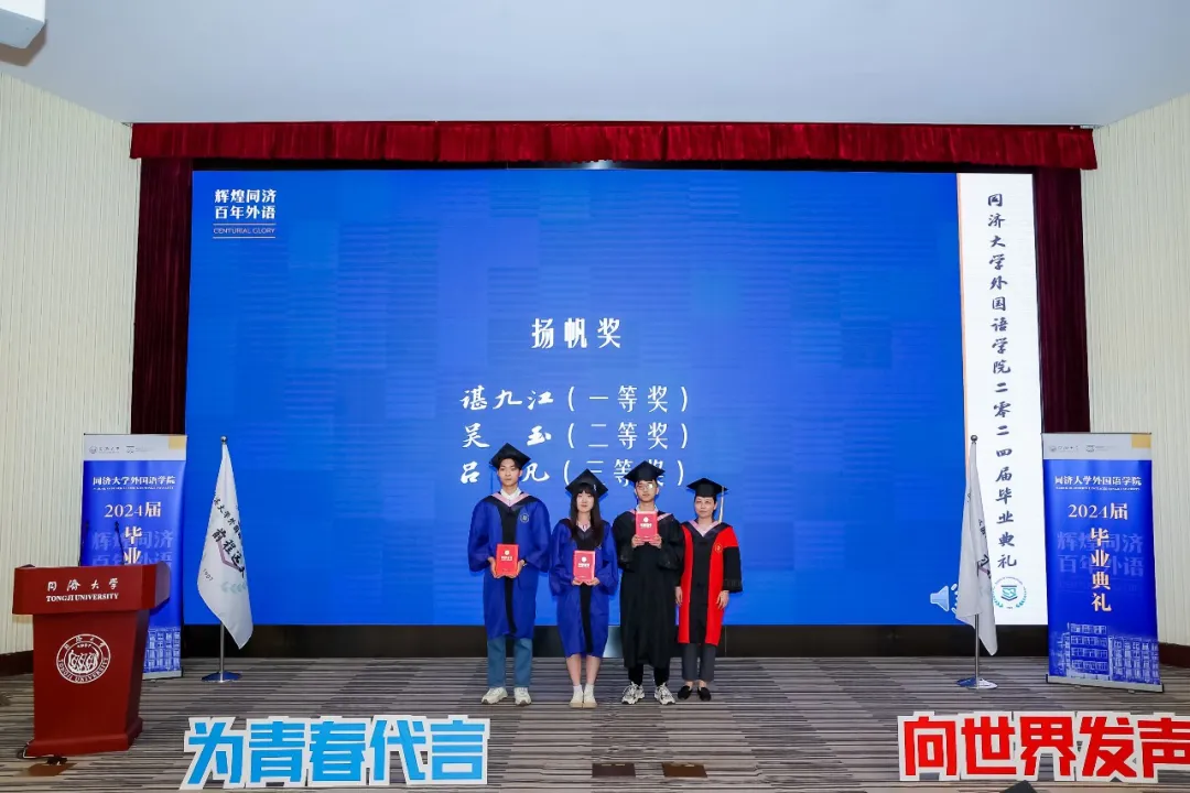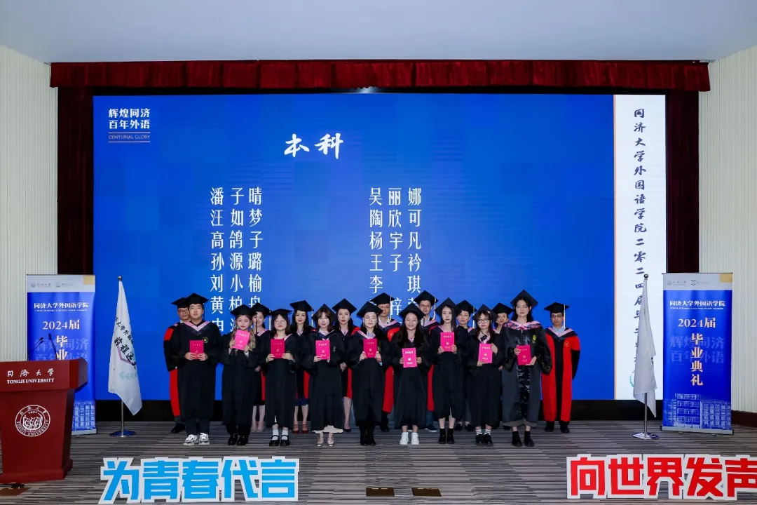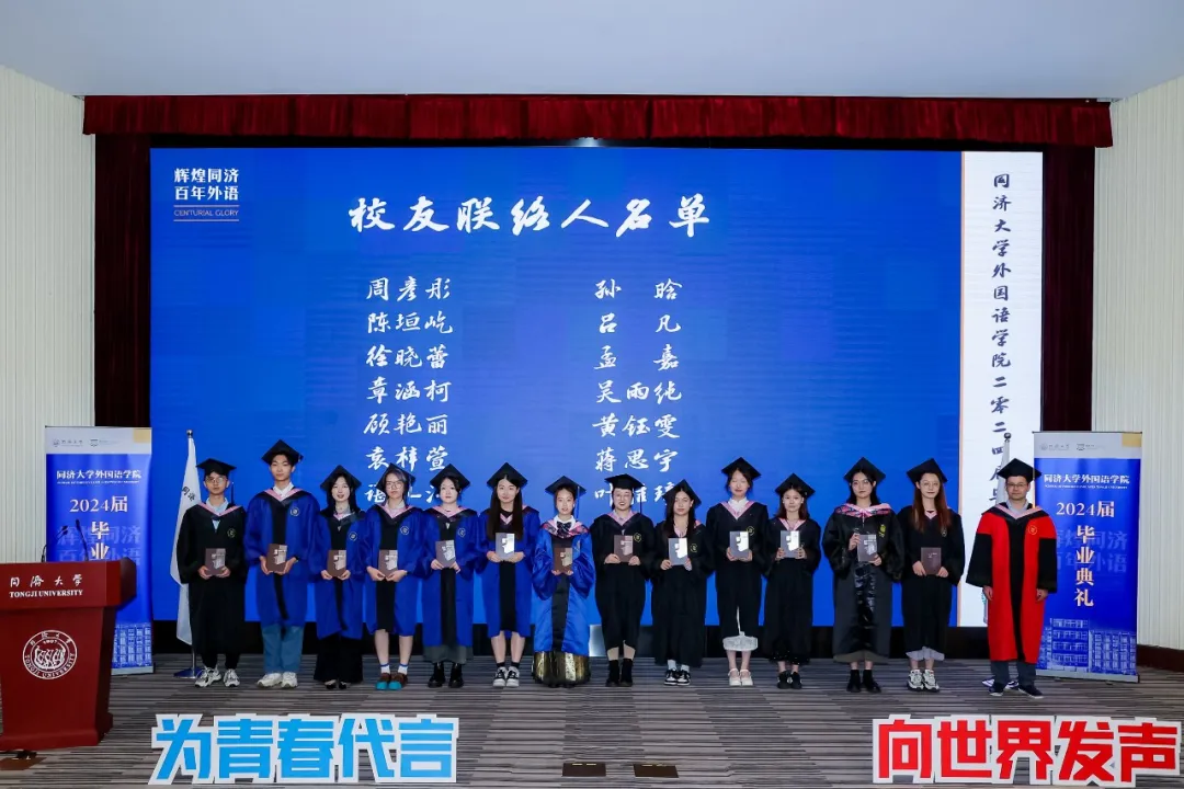 为青春代言,向世界发声。今天下午,yl8858永利集团2024届毕业典礼在逸夫楼一楼报告厅隆重举行,欢送2024届毕业生奔赴世界各地。学院党委书记郑春荣教授、院长吴贇教授、党委副书记、纪委书记宋波老师、党委副书记李疏贝副教授、副院长王蓓蕾副教授、副院长胡琪副教授、英语系主任杨小虎教授、德语系主任伍慧萍教授、教师代表周峰副教授和团委书记刘佳煊老师、学生工作办公室副主任李伟伟老师、团委副书记王雨辰老师,以及部分学院教职工、毕业生家长等出席毕业典礼。郑春荣主持毕业典礼。典礼开始前,毕业生代表演唱了毕业主题歌曲。