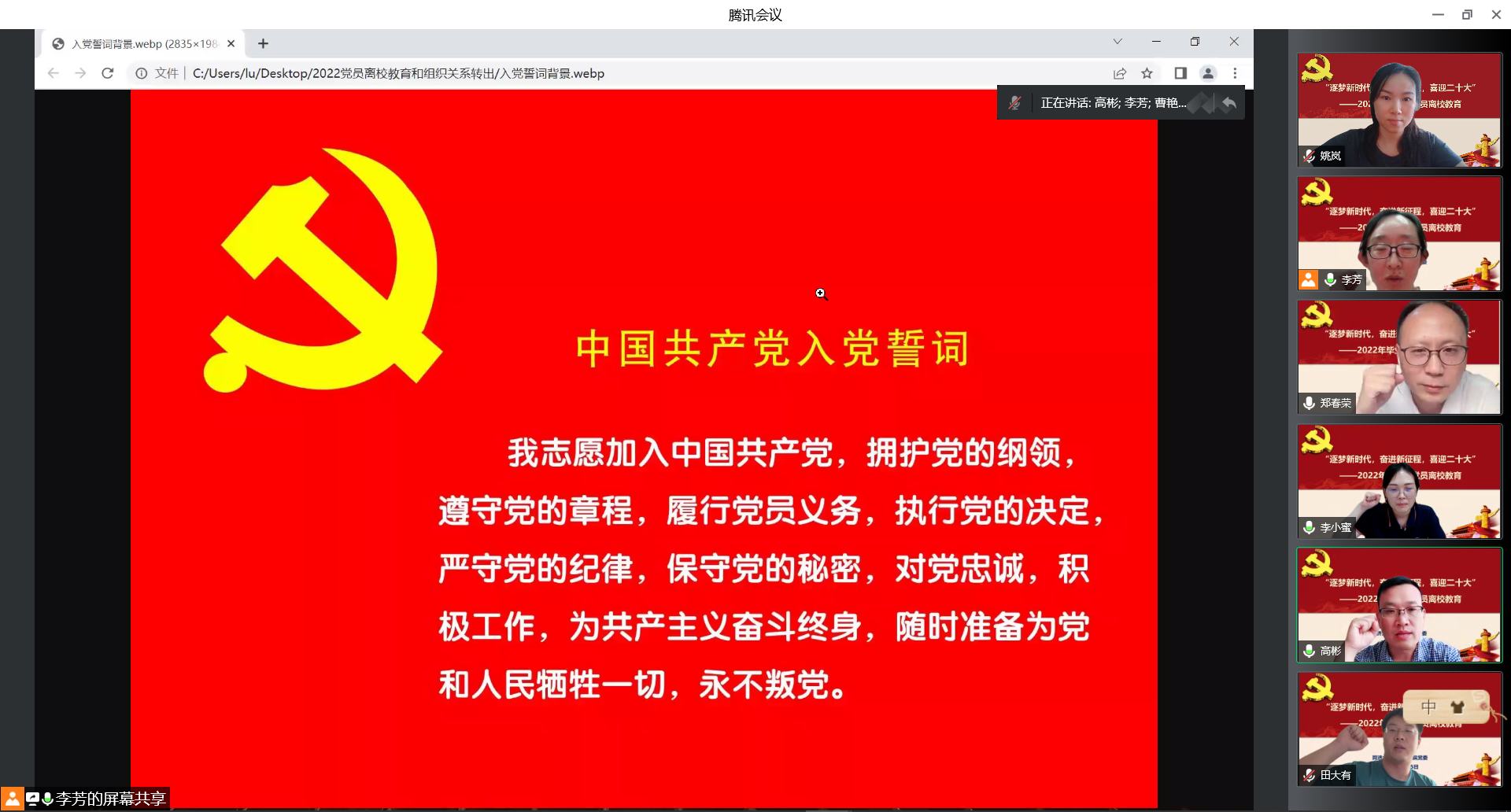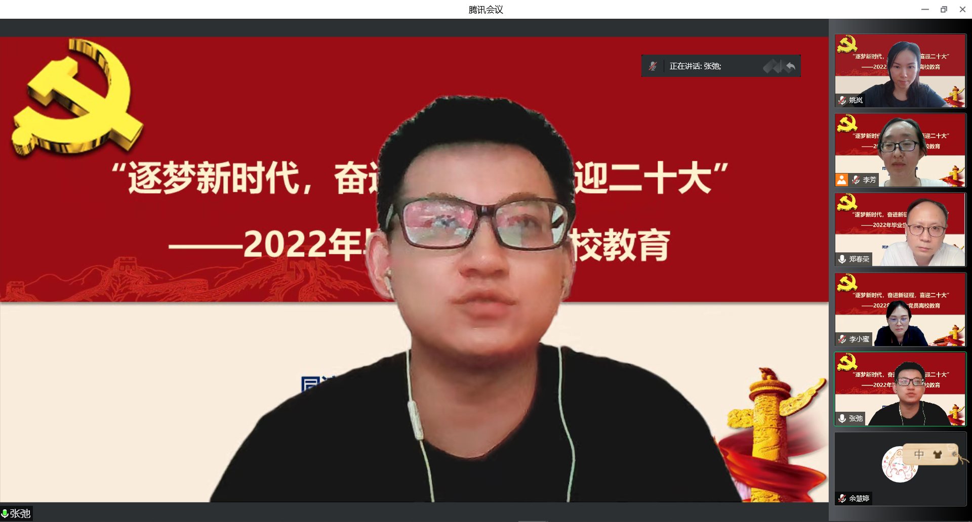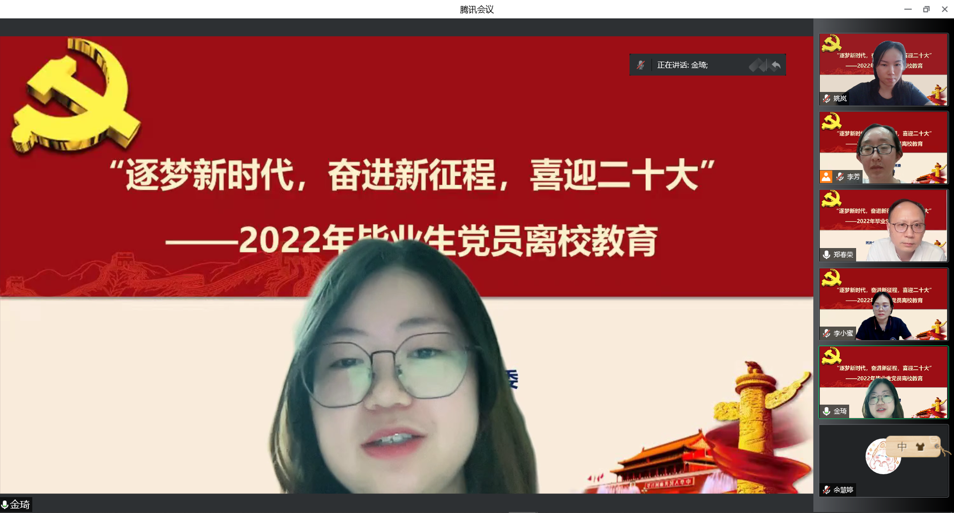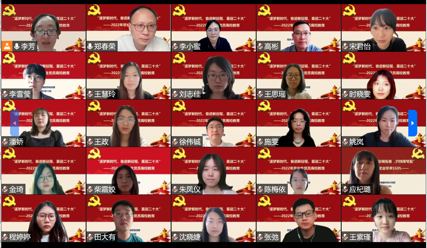 6月15日下午,yl8858永利集团党委通过“腾讯会议”在线开展了以“逐梦新时代,奋进新征程,喜迎二十大”为主题的2022年毕业生党员党性教育活动。学院党委书记郑春荣、党委副书记徐伟铖、党委委员兼组织员李芳、30多位毕业生党员以及学生党支部书记参加了本次活动。