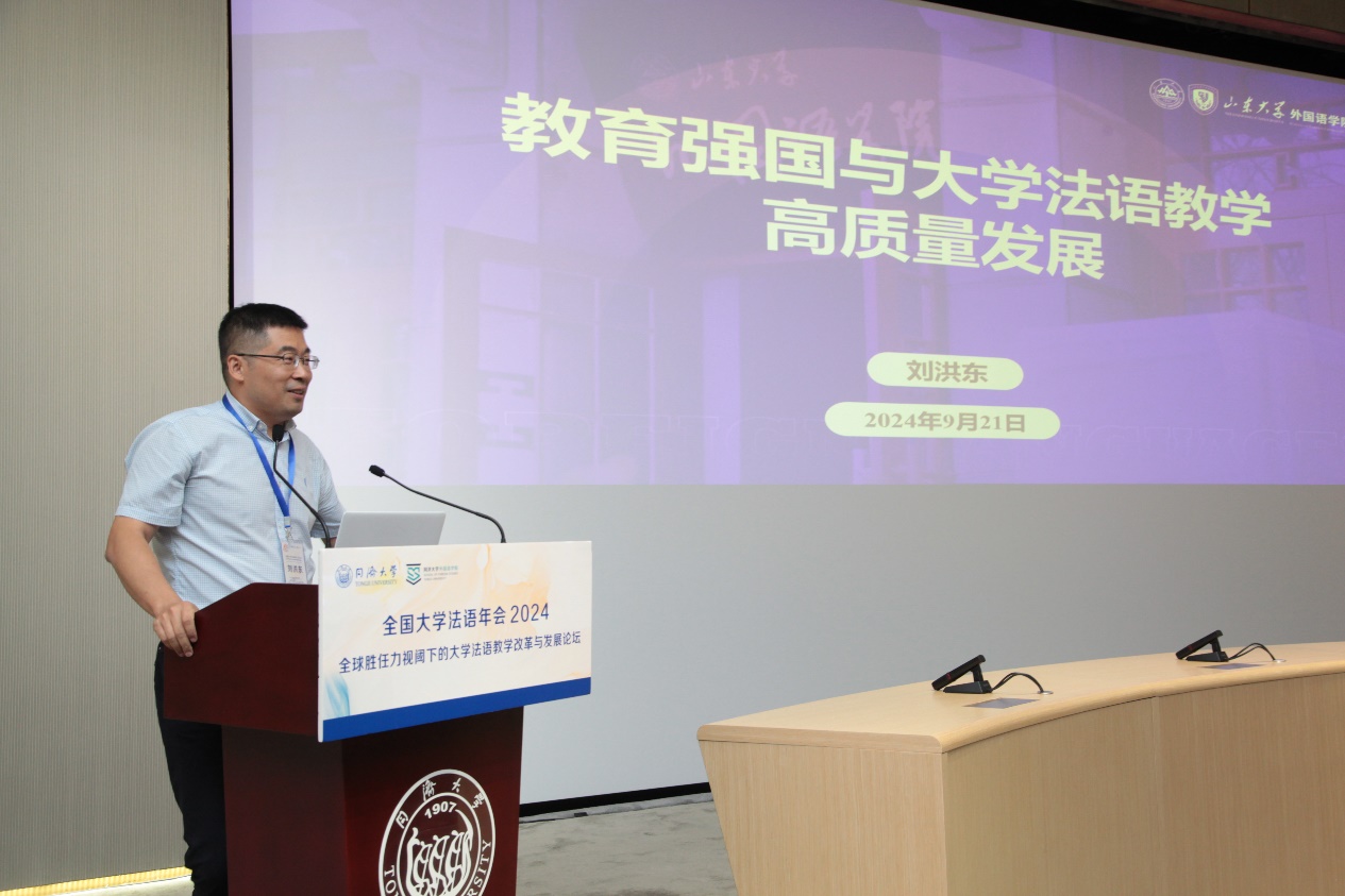 山东大学yl8858永利集团副院长、教育部大学外语教学指导委员会委员、全国新文科教育研究中心研究员刘洪东教授在大会发言中指出,面对教育强国目标,大学法语教学应紧跟国家战略,服务全球治理,培养具有国际视野和跨文化能力的复合型人才。针对新时代挑战,他提出明确课程定位、优化课程体系、创新教学模式等路径,倡导加强教材建设、完善测试评估,并规划职业发展,以全面提升法语教学质量和人才培养水平。