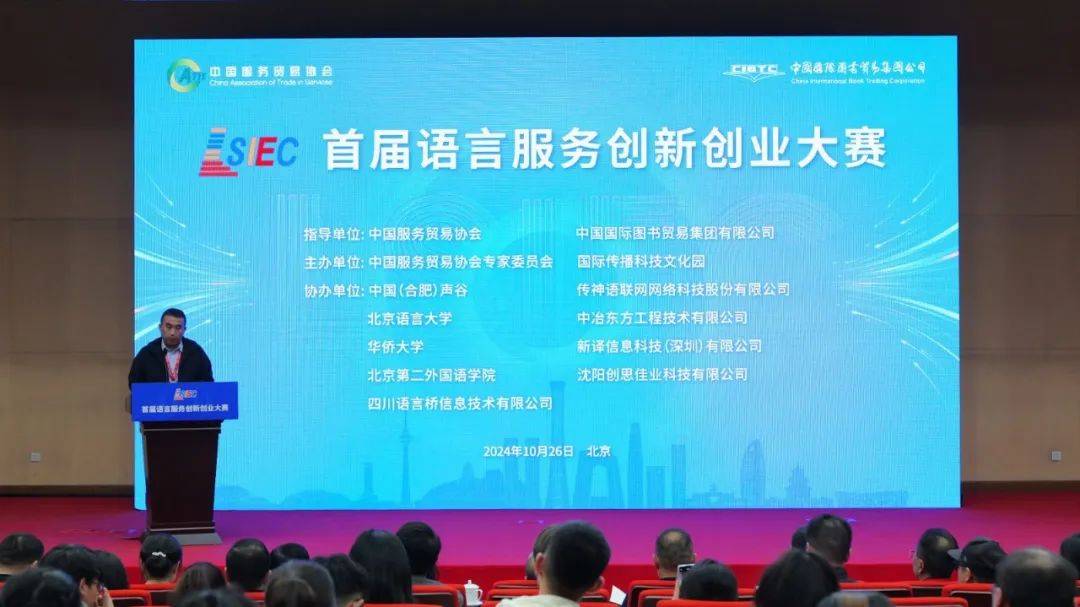 中国国际图书贸易集团有限公司、中国服务贸易协会领导出席大赛。“语言服务创新创业大赛”由中国服务贸易协会、中国国际图书贸易集团有限公司等单位主办,聚焦新质生产力,积极拥抱互联网、人工智能、大数据等数字领域新技术,倡导创新语言服务场景,聚合语言服务产业,培养高素质、专业化语言服务复合型、创新型人才,为语言服务行业高质量发展注入活力,提升国家语言服务能力。