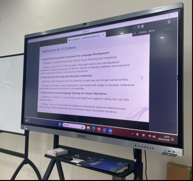 田行宇,言语-语言加工中心博士研究生,报告了耳蜗儿童词汇能力研究的近期成果,探讨了耳蜗儿童在词汇成熟度的不同维度与他们的口语叙事能力之间的关系,旨在为理解人工耳蜗儿童的语言发展提供新的视角,并为制定针对性的语言干预措施提供依据。