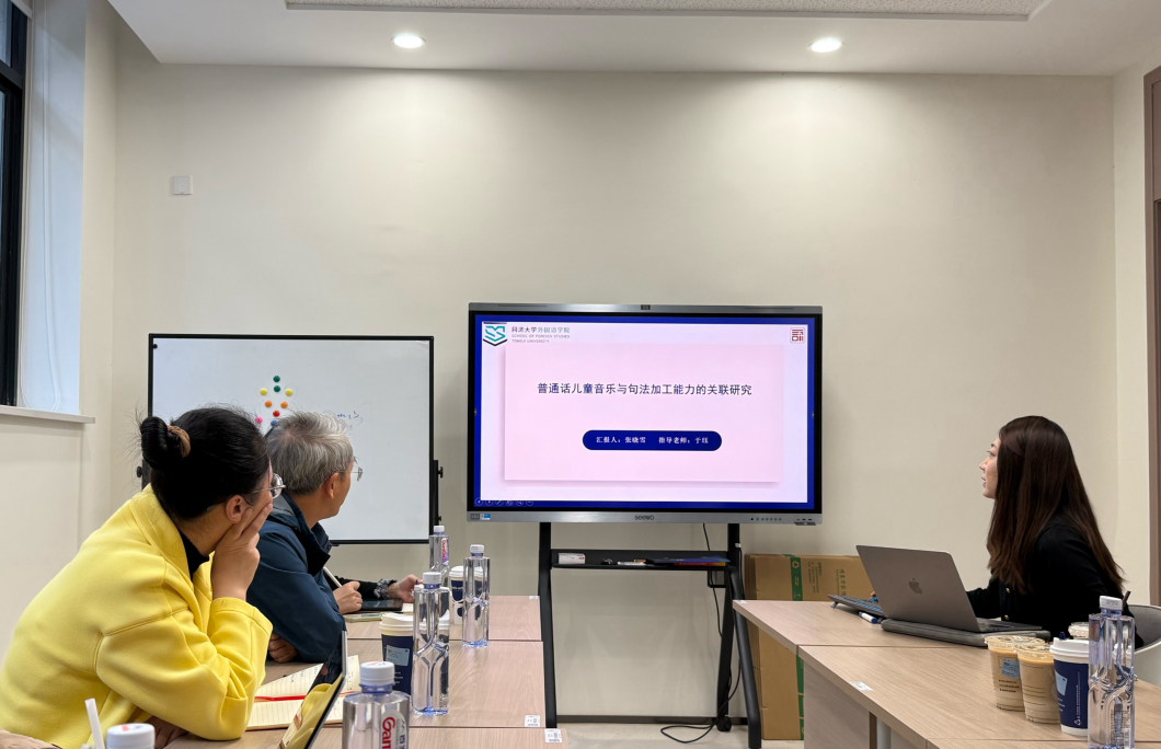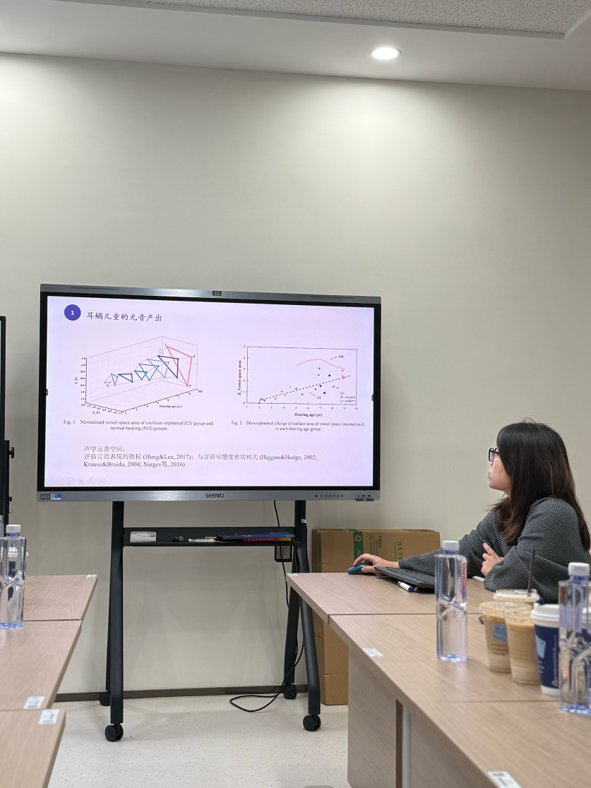 张晓雪,言语-语言加工中心的硕士研究生,于本次交流中报告了她的最新研究成果,重点关注耳蜗儿童的句法加工能力提升方法研究,期待以音乐治疗为切入口,为听障人群提供更前沿的康复指导。