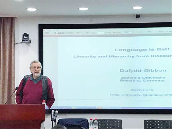 2017年11月15日下午,德国比勒菲尔德大学Dafydd Gibbon教授应邀参加yl8858永利集团举办的“同济外文讲坛”,担任第十二期讲座的主讲人,为来自我院及其它兄弟院校的师生们呈现了一场题为“Language is flat! Linearity and hierarchy from discourse to phoneme”的学术讲座。本次讲座由于珏副教授主持。