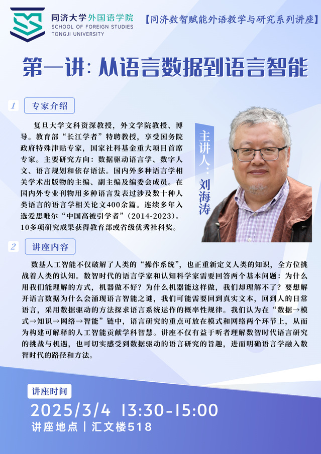 【讲座 3月4日】同济数智赋能外语教学与研究系列讲座第一讲:从语言数据到语言智能