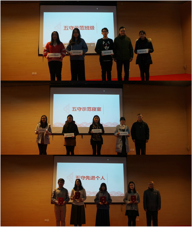 在“五守”教育活动开展过程中,涌现出不少表现突出的个人和集体,给我们留下了深刻的印象,为广大同学树立了良好的榜样。为了在学期结束之时验收教育实践成效。也为了奖励积极响应学院号召,认真贯彻落实“五守”行为规范的先进集体和个人;同时鼓励全学院同学将好习惯持续保持下去。学院开展了“五守”示范班级、示范寝室、先进个人的评选工作,并在今天的活动中进行了集中表彰。