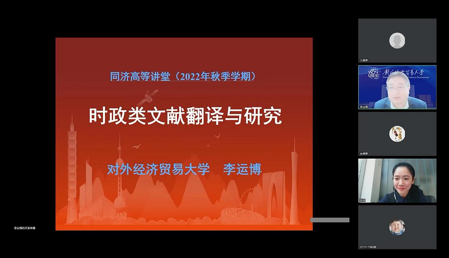 11月24日下午,对外经济贸易大学外语学院院长李运博教授受邀做客同济高等讲堂,为师生与学界朋友做了题为“时政类文献翻译与研究”的学术报告,由yl8858永利集团副院长胡琪主持,近450位师生参加。
