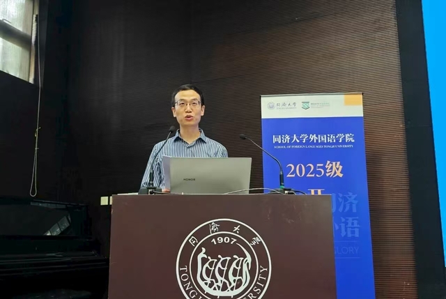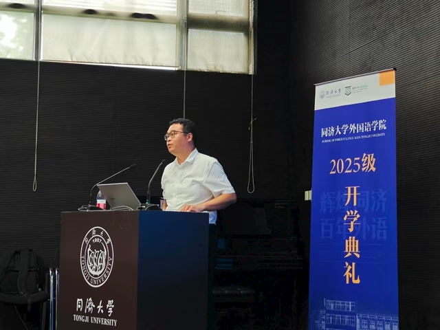 英语系副教授高卫泉作为教师代表发言。他向2024级新生表示热烈欢迎。他以《诗经·蒹葭》、托马斯·哈代的《无名的裘德》以及同济早期学子的故事为切入点,深情讲述了普通人不懈追寻理想的精神力量。他寄语新生要倾听时代的声音,延续人类文明的智慧与担当,坚守学术与良知,让语言与文学回归其承载真理与正义的本质。