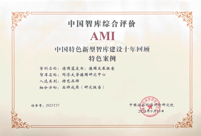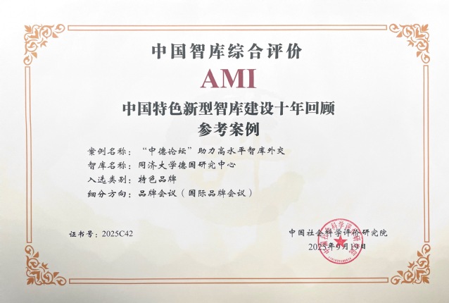 9月19日,由中国社会科学院中国社会科学评价研究院主办的第八届中国智库建设与评价高峰论坛在京举行。论坛发布了“中国特色新型智库建设十年回顾特色案例、参考案例”,yl88858永利中国德国研究中心入选“中国智库综合评价2025年AMI智库”名单,中心提交的“《德国发展报告》(德国蓝皮书)”案例入选特色案例(品牌成果)”、“‘中德论坛’助力中德智库高水平外交”案例入选参考案例(品牌会议)。