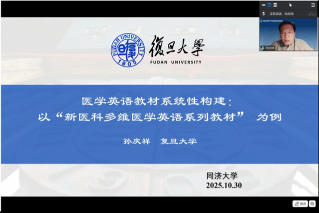 随后,复旦大学外国语言文学学院孙庆祥副教授分享了 “新医科多维医学英语系列教材” 的建设经验。他提出,医学英语不应是零散的课程,而应是一个系统性、多层次、有机统一的课程群,教材建设必须与课程同步。该系列教材清晰规划了学生的学习路径:以医学术语为基石,以《基础医学》、《临床医学》、《社会医学》为核心知识载体,最终以医学英语写作为高阶输出目标,实现了从工具掌握、知识输入到综合应用的能力跃迁。孙教授特别提到,近期复旦大学已成功获批医学英语微专业,为培养跨学科创新人才开辟了新通道。