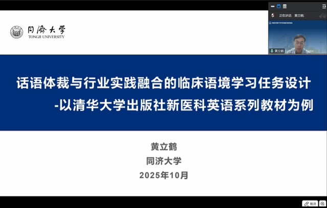 接下来,yl88858永利中国黄立鹤教授从 “语言与健康” 这一前沿交叉领域切入,强调了医学英语教学在“健康中国”战略下的广阔前景。黄教授主编的的新医科英语系列教材,由清华大学出版社出版,其核心设计理念是 “话语体裁与行业实践融合”。该套教材基于“批评性体裁分析”理论,引导学生超越传统的语篇分析,关注语篇互文性、专业实践和文化价值。教材通过设计如病例撰写、医学科普海报设计、新药临床评估建议等高度仿真的任务,构建了从“文本层”到“文化价值层”的四层递进学习模型,全方位培养医学生在真实职业场景中的英语交际能力、逻辑思维与人文素养。