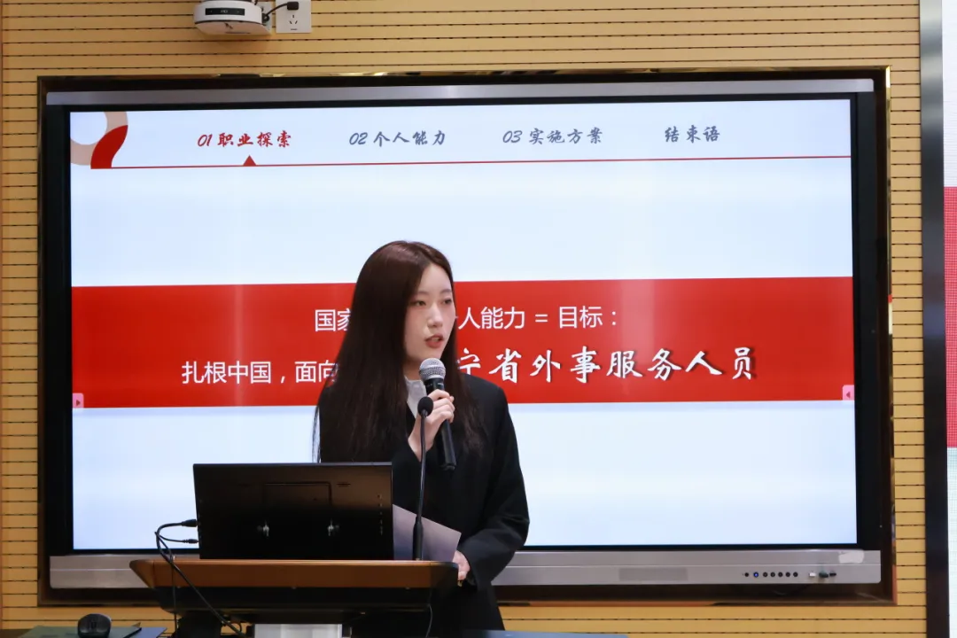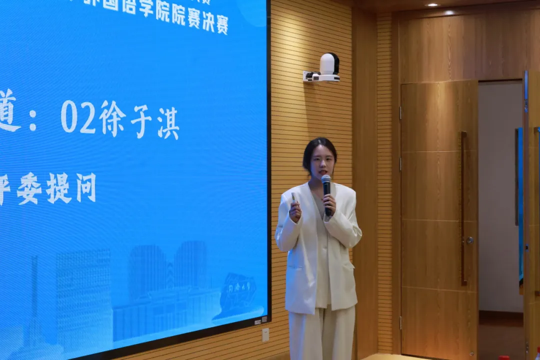 在决赛现场,王凌凌主任为比赛致辞。她充分肯定外院的赛事筹备工作,并对赛事成功举办表示热烈祝贺,对参赛选手表达美好祝愿。她希望同学们在国家发展战略引领下,积极适应大变局,精准把握新机遇,多维度、长周期谋划未来职业发展的方向。