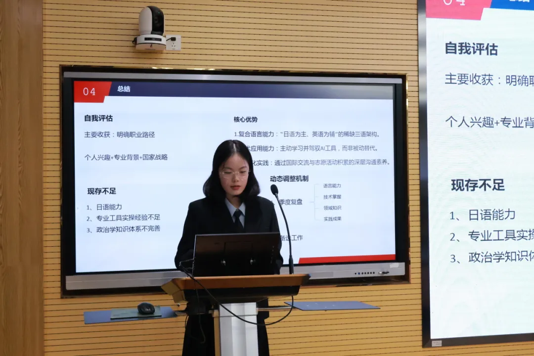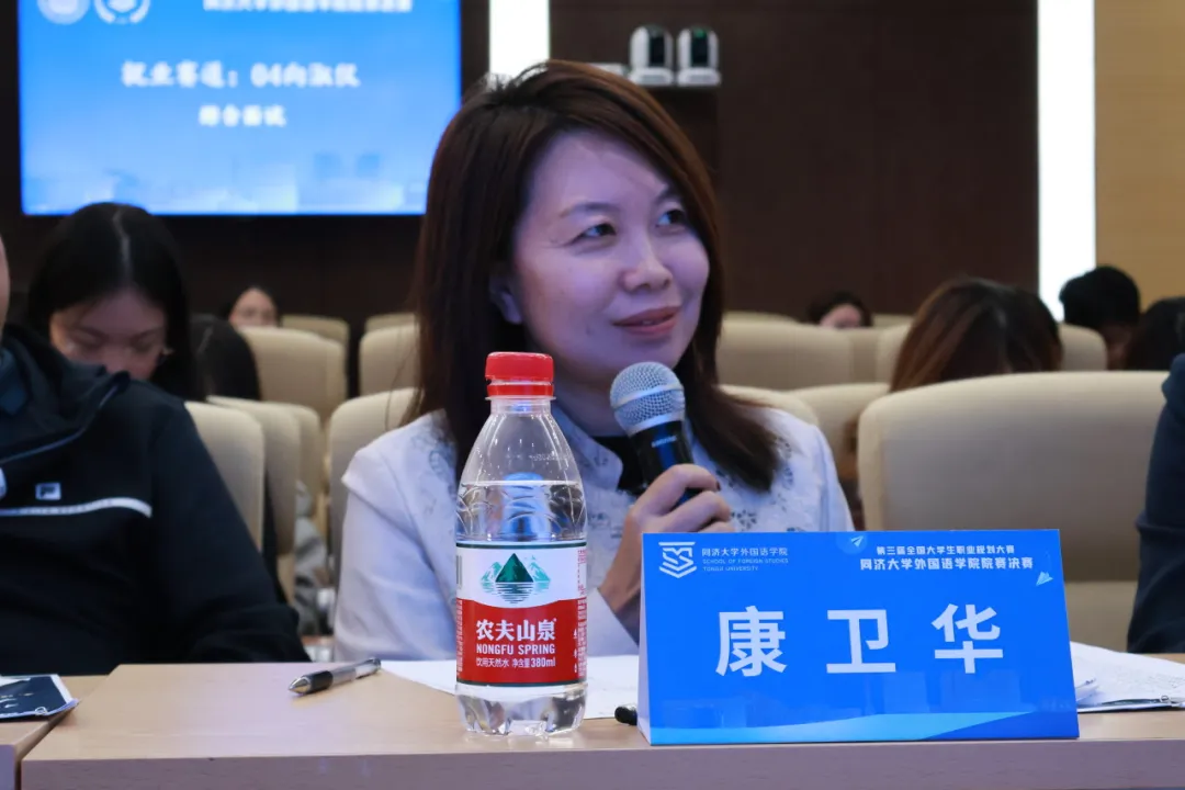 赛后康卫华评委、曹琰评委对选手表现进行专业点评。康卫华指出学生在做职业规划时应对行业前景与市场环境具备敏锐的感知力与洞察力,做到职业发展规划与前期实习积累相结合。她认为外语专业具备独特的优势,拥有不设限的视野,鼓励同学们发挥自身能力,胜任多元岗位。曹琰指出外院学子应借助语言优势,探索多元发展空间,走出跨学科、跨国别、跨文化的职业发展道路;同时希望同学们重视数智化赋能,成为无所不能的求职者。