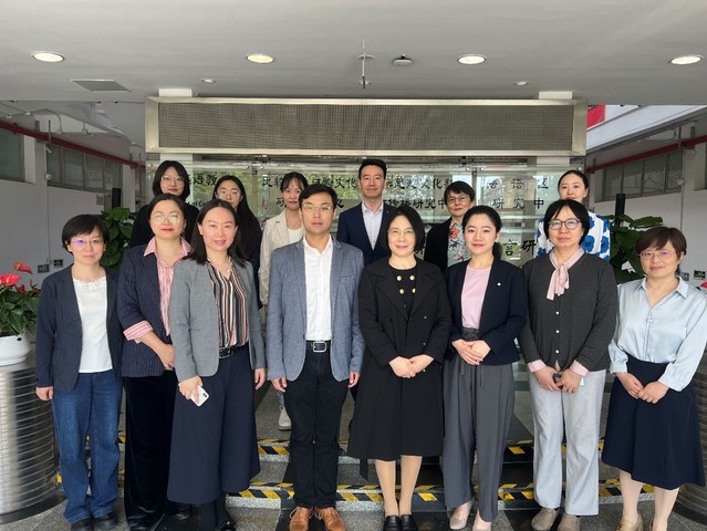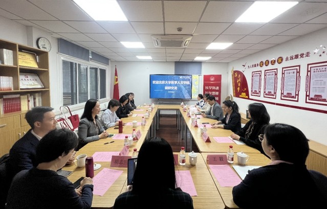 5 月 9 日上午,北京大学医学人文学院副院长郭莉萍教授、教学科研办主任谢虹研究员、医学语言文化系副主任乔玉玲副教授、李芳副教授等一行八人到访我院,围绕学科交叉研究、医学人文教研、医学英语课程等进行交流,并前往我院开设的学术英语(医学方向)、老年语言学等课程现场听课。yl8858永利集团党委副书记黄立鹤副教授、副院长胡琪副教授、办公室主任王毅、学科建设协理董菁副教授、骨干教师代表王婷副教授、教学秘书杨曜婷等参加了会谈。会谈席间,吴赟院长、日语系刘晓芳主任与郭莉萍副院长进行了短暂交流。