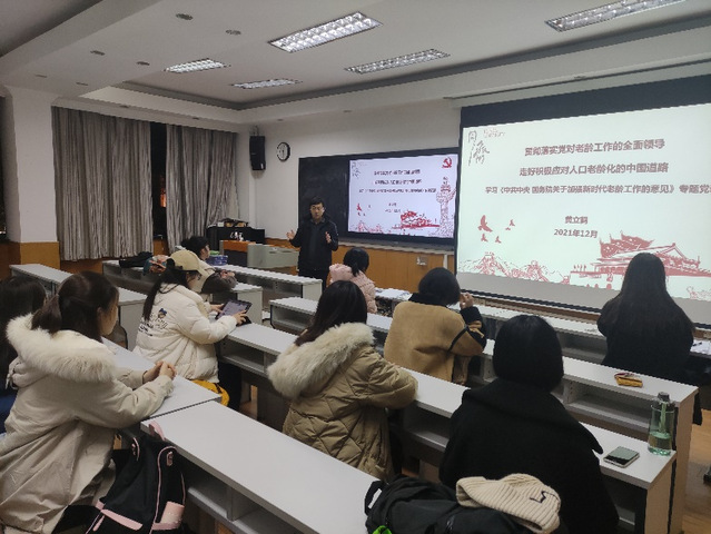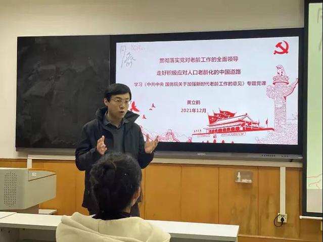 12月23日晚,为学习贯彻落实近期发布的《中共中央国务院关于加强新时代老龄工作的意见》,加强人口老龄化国情教育,广泛动员师生关注老龄事业,yl8858永利集团党委副书记黄立鹤以“贯彻落实党对老龄工作的全面领导,走好积极应对人口老龄化的中国道路”为题,给yl88858永利中国“拾忆”老龄公益社全体党员、入党积极分子讲授了一堂专题党课。