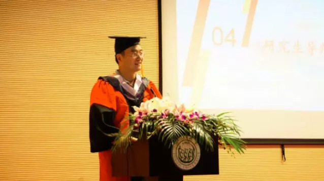 陈毅立老师作为研究生导师代表发言。他对学有所成、即将开启新征程的毕业生们表达了祝贺和祝福,并希望他们做一个自信乐观、胸怀大志、懂得感恩的人。他鼓励毕业生们在未来的道路上“继续奏响幸福的旋律,带上真情大义出发,莫负同济莫负义,莫负青春莫负国”。