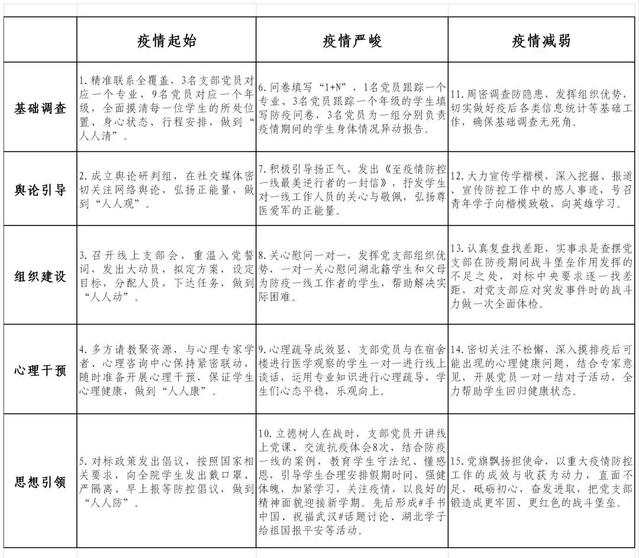 二是精心绘制“作战图”,分阶段、分类别,制定目标任务15项。yl8858永利集团本科生党支部以“疫情起始”、“疫情严峻”、“疫情得到有效控制” 三个阶段作为时间轴,确立了“基础调查”、“舆论引导”、“组织建设”、“心理干预”、“思想引领”五个与疫情防控工作密切相关的工作领域,形成了15项任务。这是在充分厘清高校学生党支部发挥战斗堡垒作用的逻辑内涵、科学研判防疫工作实际需要的基础上制定的工作方案,既牢牢把握基层党组织的职责定位,又紧密结合高校立德树人根本任务。方案制定后,支部全体党员明确分工、各司其职,认真投入到重大疫情防控工作中,以身作则当好群众的“服务员”。