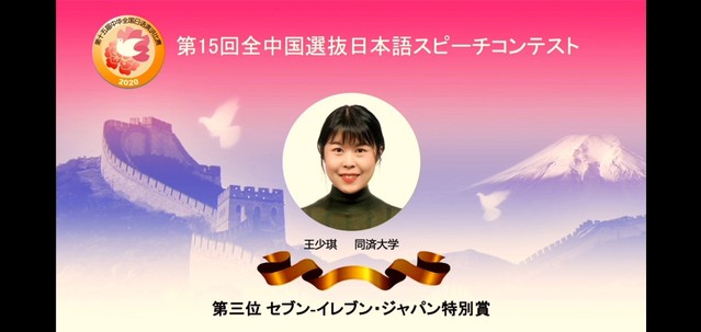 王少琪同学在去年年底举办的中华全国日语演讲比赛(华东赛区)预赛中,以第一名的成绩获得华东赛区特等奖。本次代表华东赛区参加全国总决赛,是我校学生第一次赢得预赛进入全国总决赛,取得了历史性的突破。本次比赛不仅向外界展示了同济学子的优秀专业素养和良好的精神风貌,而且体现出了日语系专业在不断探索人才培养新模式后取得的成效。