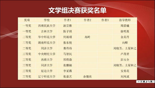 本次大赛的决赛以在线答辩的形式举行,选手们通过线上抽签依次进入线上会议室,用日语进行论文阐述并现场答辩。为了确保比赛的顺利进行,日语系教师刘晓芳、土屋和之等对参赛选手进行了多次赛前辅导,并对比赛当天的音频、视频、网络设备等进行了多次测试。最终,曹丹炜、张雅楠两位同学凭借扎实的日语功底、新颖的论文选题、灵活的应变能力、出色的思辨的能力和丰富的知识储备,分别获得文学组的二、三等奖。