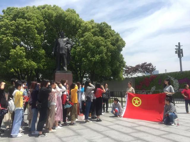 上午十时许,团员青年到达人民英雄纪念塔。人民英雄纪念塔建成于1993年,是为了缅怀自1840年以来为解放上海而献出生命的革命先烈而建成的纪念性建筑。团员青年们了解到,三块枪状塔体象征着鸦片战争、五四运动、解放战争以来光荣牺牲的先烈永垂不朽。巨大的下沉式广场给人们提供了瞻仰和怀念先烈的空间。纪念塔环型的墙面镌刻着上海百年来的革命斗争历史。紧接着,团员青年们瞻仰了陈毅像。像体基座正面镌刻着“陈毅”和“1901—1972”。这尊铜像再现了陈毅在担任新中国第一任上海市长时视察工作的典型姿态,显示他一路风尘、勤勤恳恳的公仆形象,又有和蔼可亲、虚怀若谷的儒将风度。